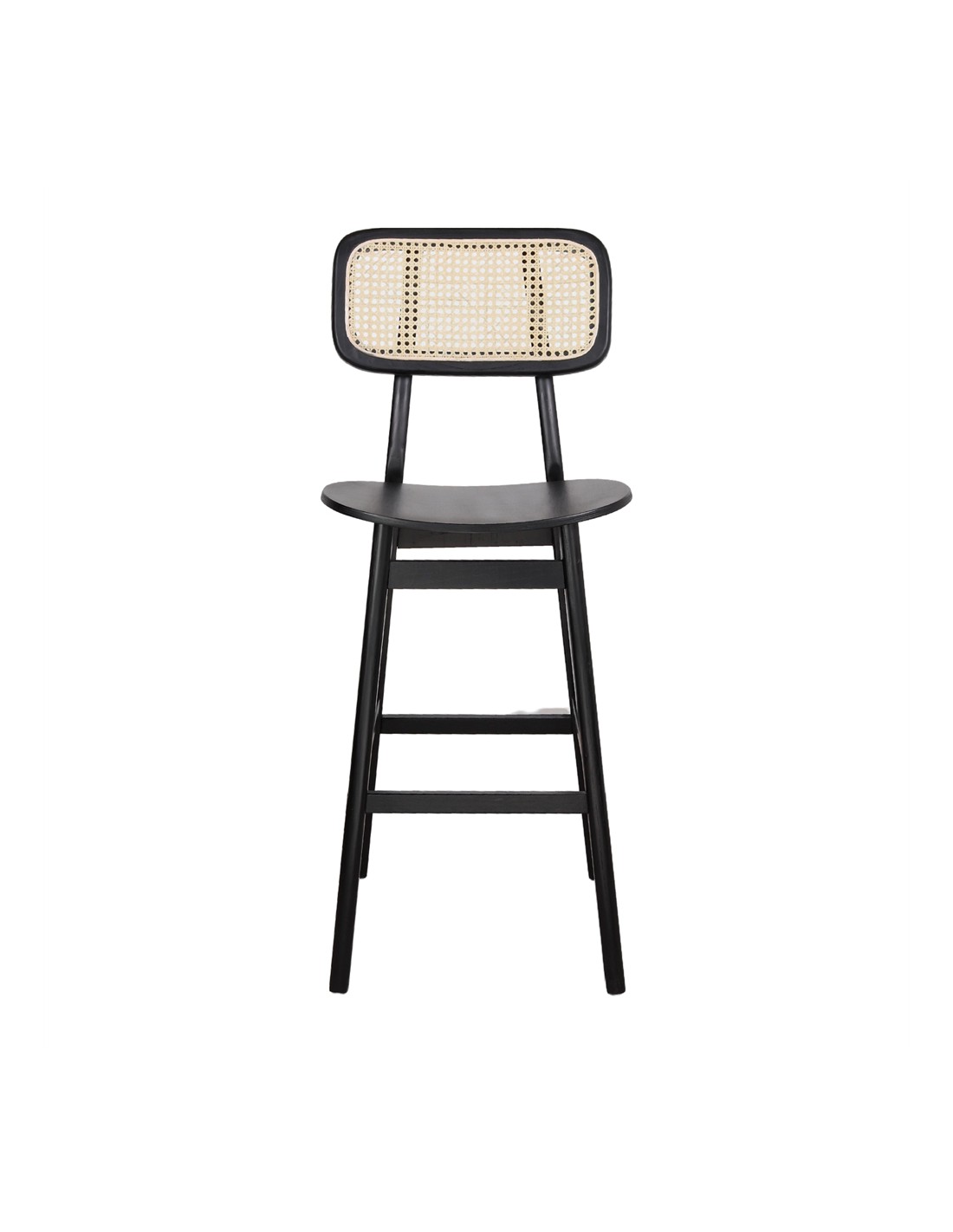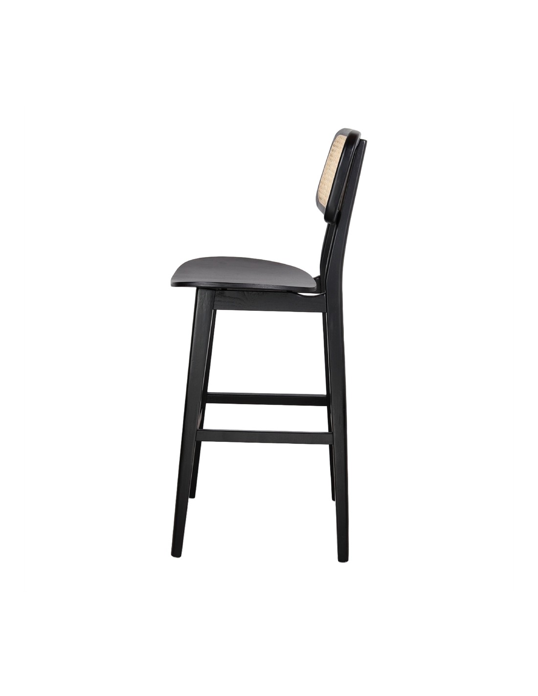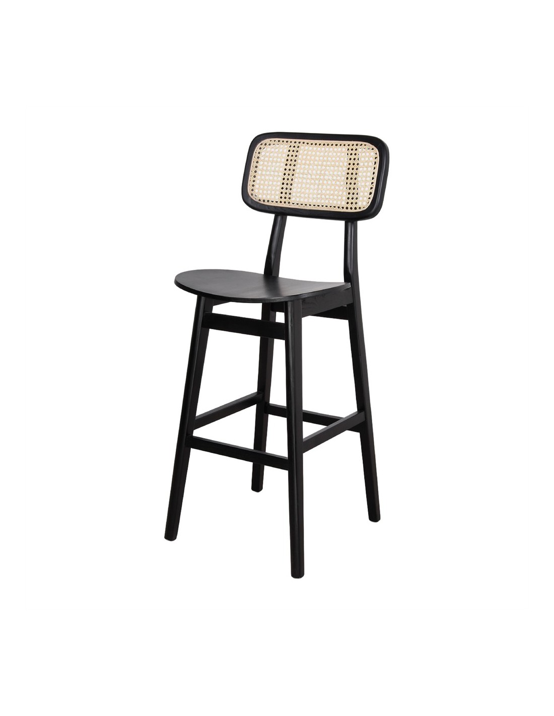 Taburete alto estilo vintage-bistró fabricado en madera maciza de olmo con respaldo en rejilla de rattan natural y asiento en madera contrachapada. Acabado en pintura negra. Medidas: 52x48x113 cm | Altura del asiento: 77 cm