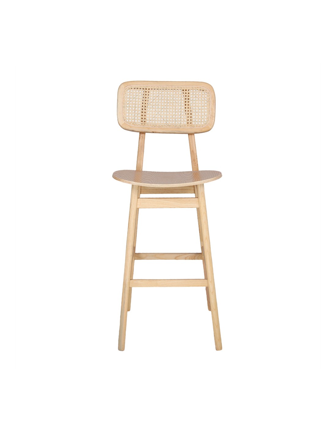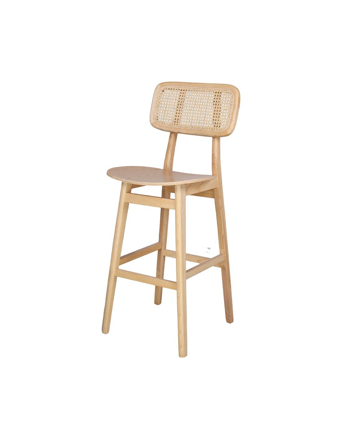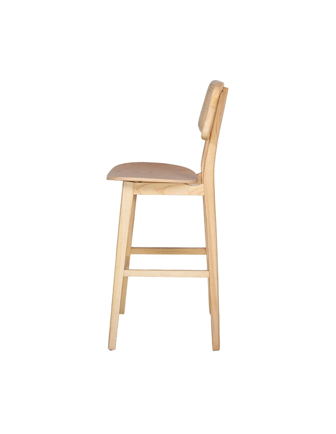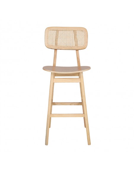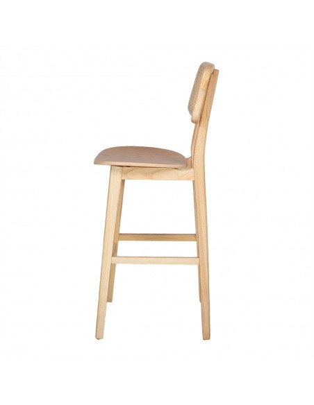 Taburete alto estilo vintage-bistró fabricado en madera maciza de olmo con respaldo en rejilla de rattan natural y asiento en madera contrachapada. Acabado en barniz transparente. Medidas: 52x48x113 cm | Altura del asiento: 77 cm